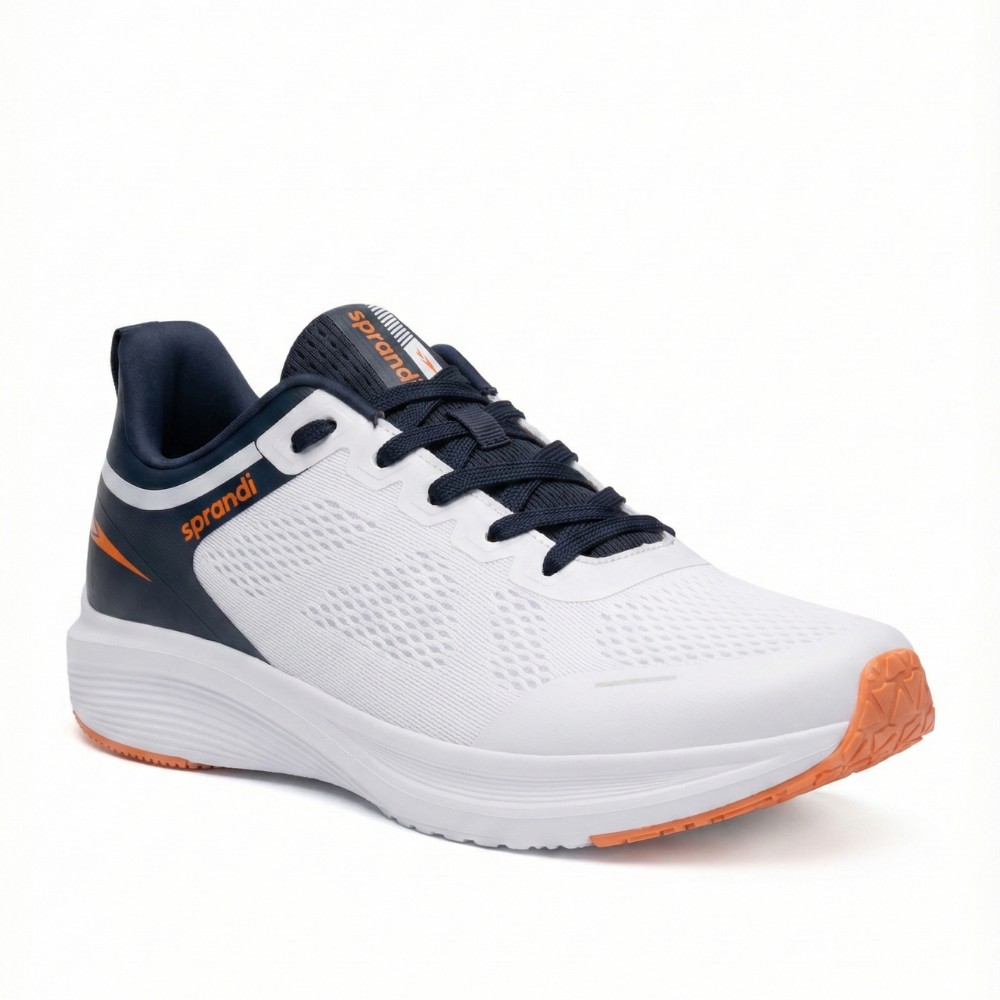 Представлені в магазині N-SHOES, ці кросівки привертають увагу ефектним поєднанням білосніжного верху, глибоких темно-синіх вставок та динамічних помаранчевих деталей. Завдяки використанню дихаючого текстильного матеріалу (сітки), вони забезпечують не лише довговічність, але й винятковий комфорт та вентиляцію протягом усього дня.