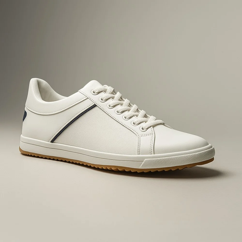 Первое, что бросается в глаза — это минималистичный дизайн с характером. Чистый белый верх из натуральной кожи разбавлен тонкой синей полосой по бокам и кремовой подошвой — выглядит дорого и стильно, прямо как у топовых премиум-брендов.