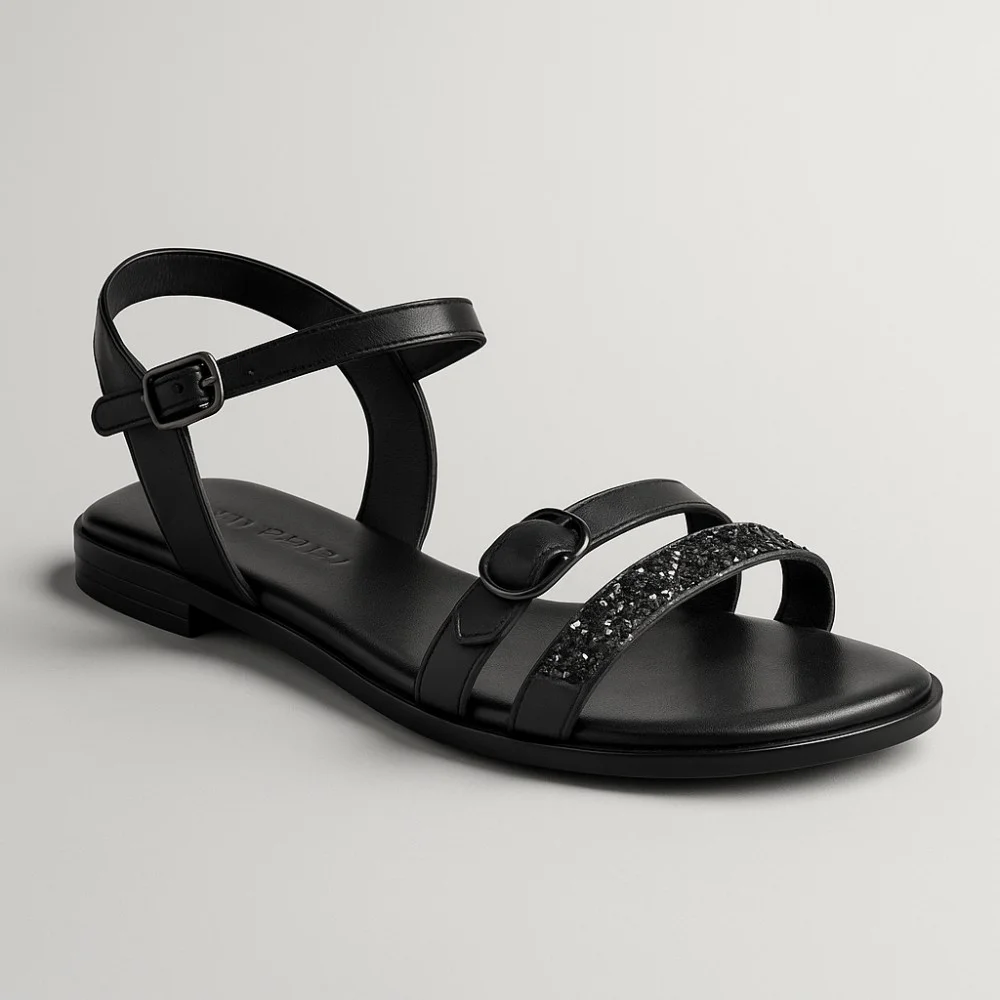 These sandals have an elegant design that is suitable for both everyday walks and special occasions. Their comfortable dual straps, one with sequins and the other with a buckle, allow you to fine-tune the perfect fit for your feet. The sandals fasten with a buckle at the ankle for perfect support.