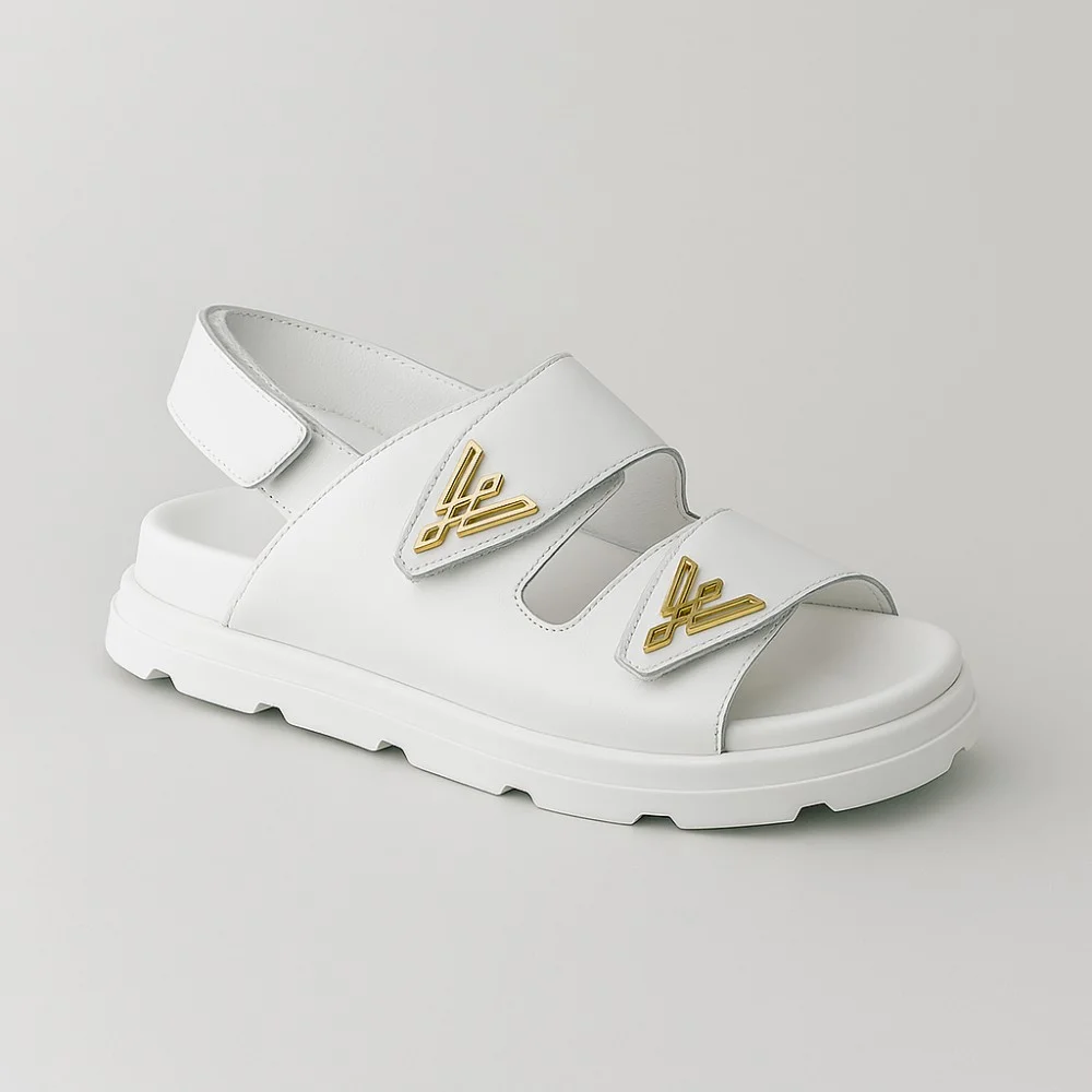 Elegant gold logos and contrast stitching add sophistication to the minimalist design. The neutral white color allows you to combine sandals with any shade of clothing.