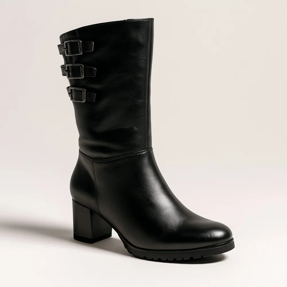 Жіночі чоботи Covalli чорного кольору, з натуральної шкіри, у взутті використовується каблук розкльошений висотою 5 см. Форма кінчика гостра.